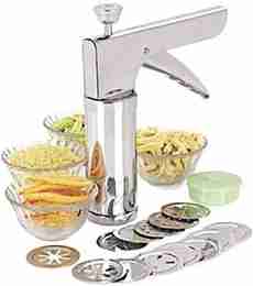 Made from high-quality stainless steel for long life and rust-free performance., Multi-purpose kitchen press ideal for making Sev, Chakli, Murukku, Bhujia, Gathiya, and Namkeen easily at home., Comes with 15 different jali discs for creating a variety of snacks and shapes., Heavy-duty and durable build quality ensures smooth and easy operation.