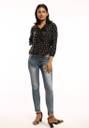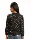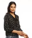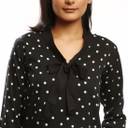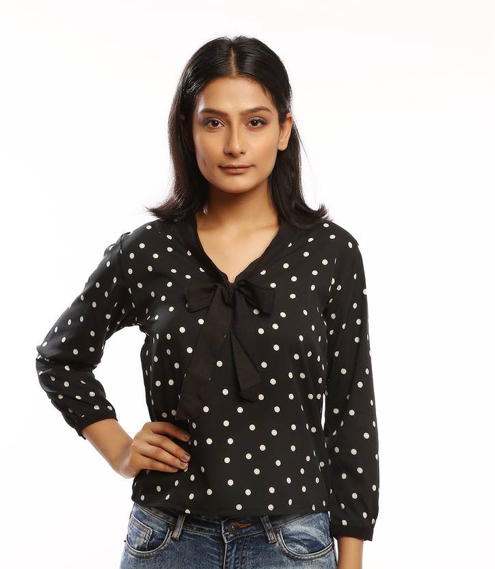 This is a trendy polka print top designed by Rimsha Wear made of crepe will make your day out amazing, it features a V neck with knot and tie style, 3/4th regular sleeve, regular fit and standard length, soft crepe fabric, colour black, it is hand wash product only do not bleach