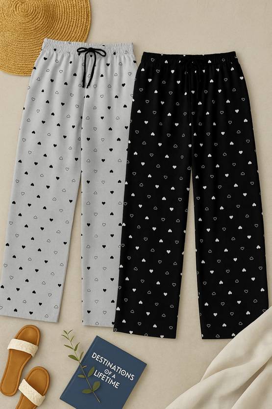 💖 Premium Quality Fabric, Made from ultra-soft & breathable cotton blend for all-day comfort 👗 Trendy Heart Print Design, Stylish all-over heart print to keep your look fashionable even at home 💤 Perfect for Lounge & Sleep, Lightweight & cozy pyjamas ideal for nightwear, lounging, or casual wear 🎀 Elastic Waistband with Drawstring, Adjustable fit ensures maximum comfort & flexibility 🌸 Versatile Pairing, Can be styled with tees, tank tops, or kurtis for a chic casual look 🧺 Easy Care, Machine washable, color fade resistant & durable for long-lasting use 🎁 Value Pack of 2, Comes with 2 stylish pyjamas – perfect for daily wear & gifting