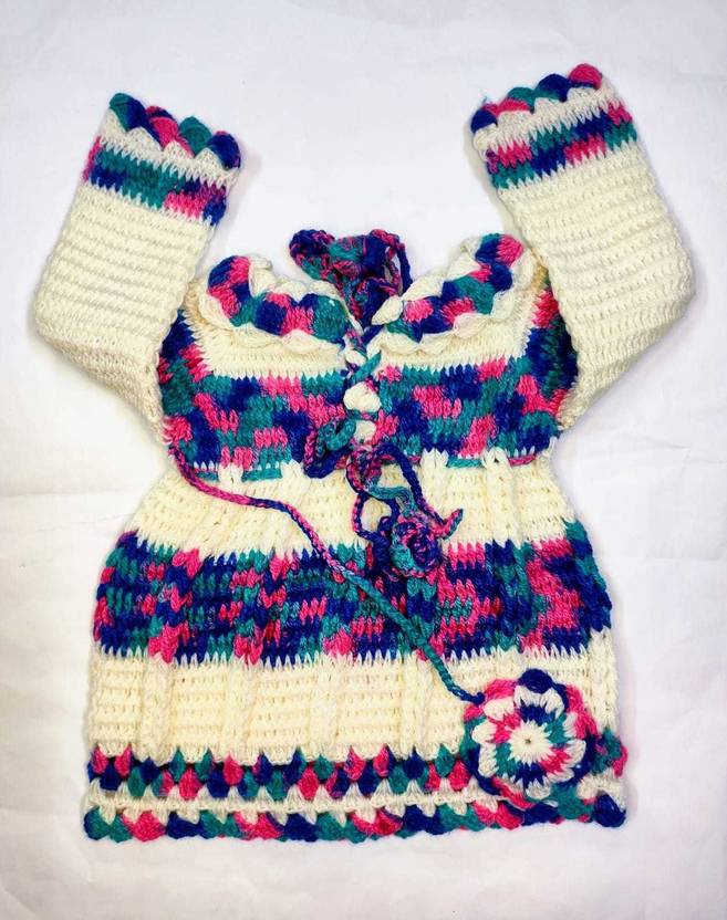 This is a woolen frock which is hand made with Verdhman 4 ply wool. Very cozy and comfortable and skin friendly too. Pattern and design may vary. But material is surely very high quality.