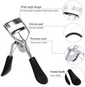 Gives precision curling, Easy grip, Has a half rounded curling pad, Easy to use. Eyelash Curler Tip Material: Steel. The special contoured design hugs your eyelids and curls even those tiny lashes at the corner of your eyes without accidentally pulling away.