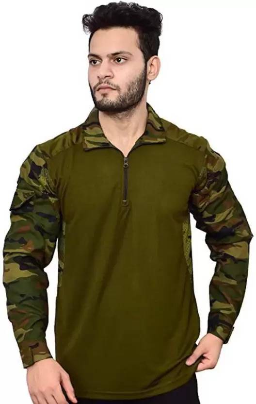 Riya Gold Military Camouflage Men Zip Neck Green T-Shirt
