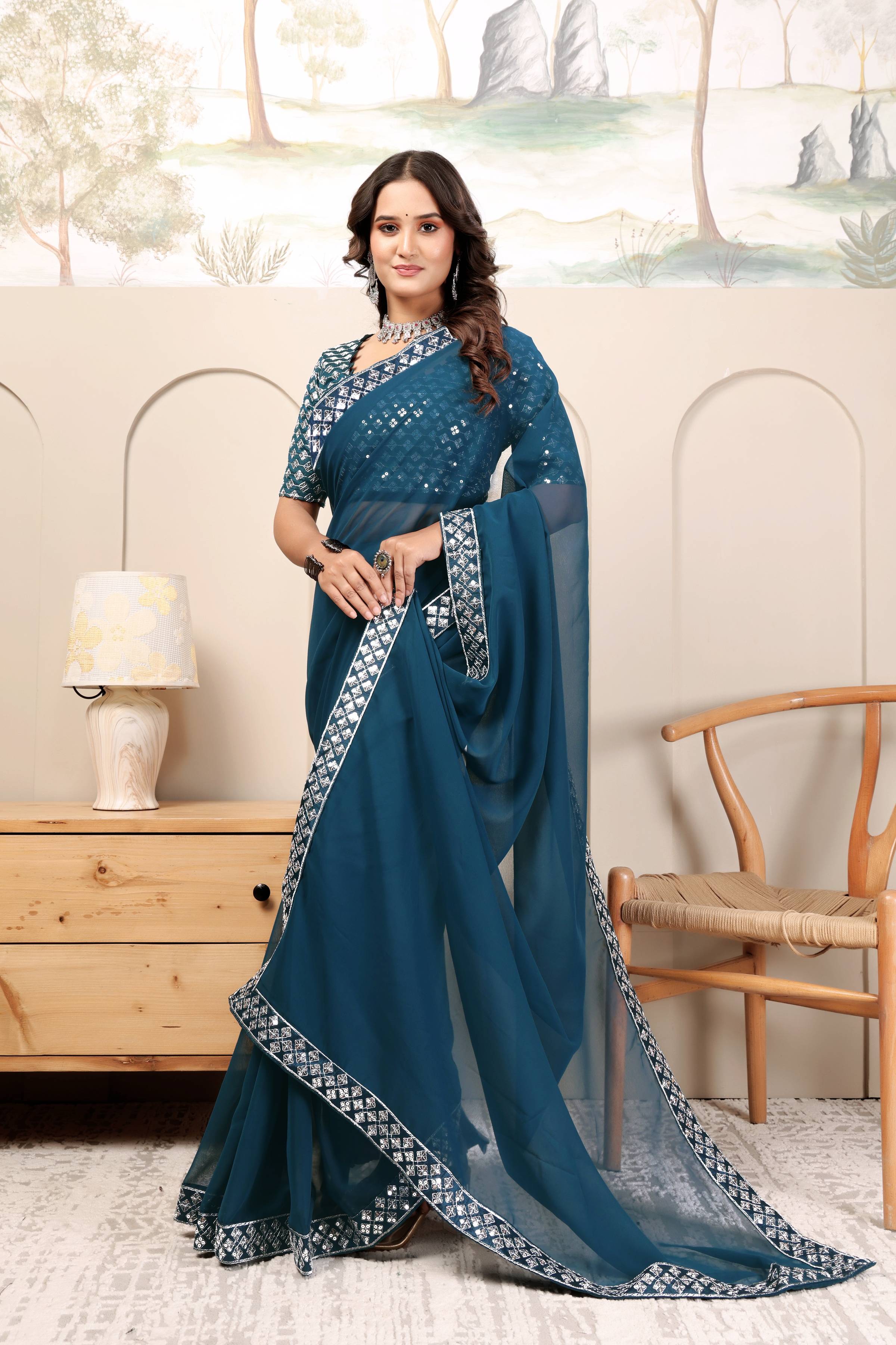 Elevate your ethnic wardrobe with this premium georgette saree featuring intricate mirror work. Designed for women who love a blend of elegance and glamour, this saree is perfect for weddings, parties, and festive celebrations. Its soft georgette fabric ensures a graceful fall and unmatched comfort throughout the day.
