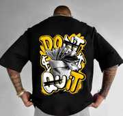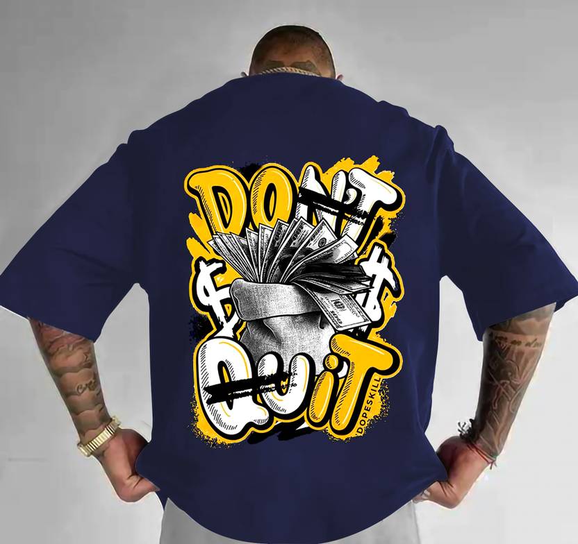 our exquisite loose-fitting blue T-shirt, a garment that transcends mere fashion to become a symbol of strength and perseverance. Elegantly emblazoned with the inspiring phrase "Don't Quit," this shirt is more than just a piece of clothing; it is a daily affirmation to push through life's obstacles with unwavering resolve. Crafted from the finest, breathable cotton, it envelops you in unparalleled comfort, making it the perfect companion for both your most challenging days and your moments of relaxation. The rich azure hue not only exudes a sense of calm and confidence but also complements a myriad of styles, ensuring that it seamlessly integrates into any wardrobe. Whether you're dressing for a casual outing with friends or gearing up for an invigorating workout session, this T-shirt stands ready to support you in every endeavor.The design of this T-shirt is a masterful fusion of simplicity and motivation, featuring bold, striking typography that commands attention while maintaining an air of understated elegance. The loose fit drapes effortlessly over the body, allowing for unrestricted movement and a relaxed silhouette that flatters all body types. This versatility makes it ideal for layering under a jacket or wearing solo as a statement piece. For those who appreciate a lifestyle that values both style and substance, this T-shirt embodies the perfect balance, encouraging you to embrace comfort without sacrificing your personal aesthetic. It serves as a reminder that fashion can be both functional and inspirational, making it a must-have addition to your collection.The versatility of this blue T-shirt allows you to pair it effortlessly with tailored joggers for a chic athleisure vibe or with your favorite denim for a laid-back weekend ensemble. Whether you're hitting the gym, running errands, or simply enjoying a leisurely day at home, this T-shirt serves as a canvas for your personal mantra, encouraging you to embrace every moment with tenacity and grace. Make a bold statement and let your attire reflect your unwavering spirit. With this T-shirt, you are not just wearing a piece of clothing; you are showcasing a mindset that champions resilience and determination, inspiring others to do the same.