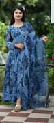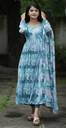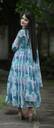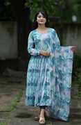 Here are the bullet points for the product shown in the image: Product Type: Gradient-colored Anarkali Dress with Dupatta Material: Soft, lightweight fabric, likely chiffon or georgette Color Gradient: Dress: Light blue at the top, transitioning to soft peach and pink towards the hem Dupatta: Matching color gradient with a lace border Sleeves: Full-length sleeves with a similar gradient pattern as the dress Neckline: Simple round neck design Additional Details: The dress has a gathered waistline for a flowy, elegant drape Occasion: Suitable for festive events, weddings, or special occasions Accessories: Often paired with dangling earrings and high-heeled sandals, as seen in previous images Care Instructions: Likely to require gentle hand wash or dry cleaning due to delicate fabric This product offers a serene and elegant look, perfect for occasions where a subtle yet eye-catching outfit is desired