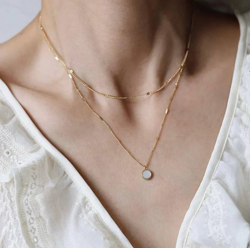 Add a touch of timeless elegance to your everyday look with this minimalist layered necklace. Featuring two delicate gold chains, one plain and one with a sleek round white charm, this piece is perfect for effortless layering. Whether you're dressing up for brunch or keeping it simple at work, this necklace brings grace to any outfit.
