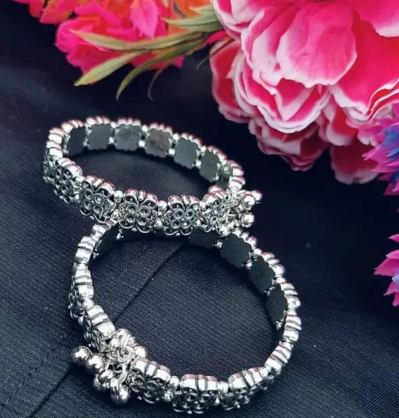 Appearance: Features a dark, antiqued silver finish, often with intricate designs like floral patterns or traditional Indian motifs. Some designs may include small bells or other embellishments.