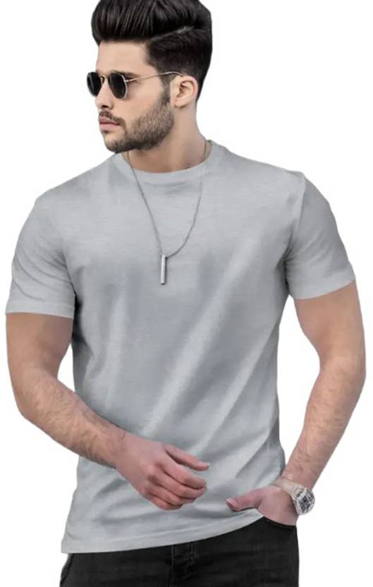 Mishitha Solid Men Round Neck Silver T-Shirt