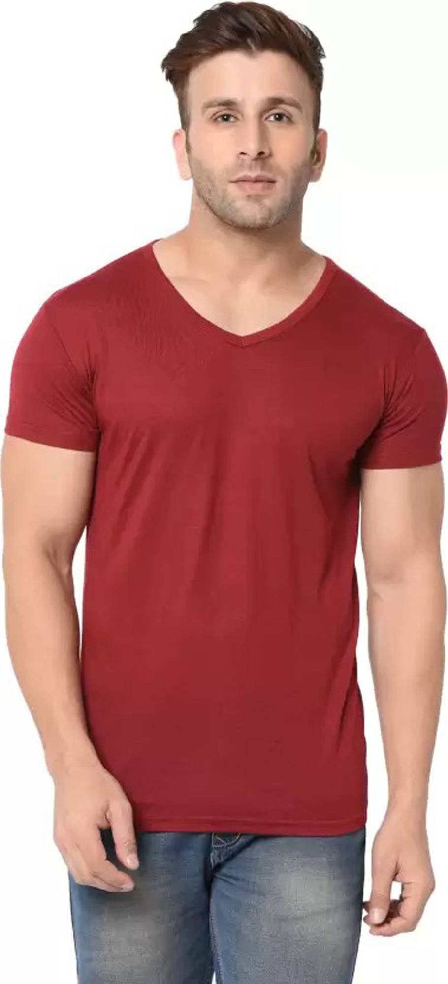 RLP Men Solid V Neck Polyester Maroon T-Shirt