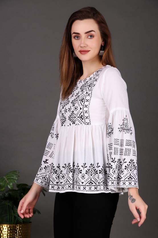 RNfab Casual Bell Sleeves Printed Women White, Black Top