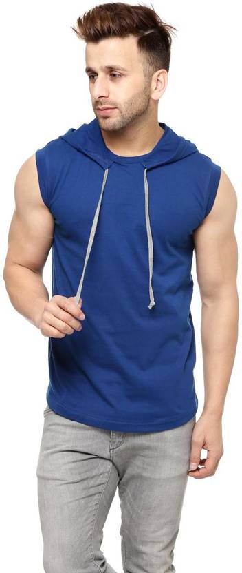 roadmarck Men Solid Hooded Neck Cotton Blend Blue T-Shirt