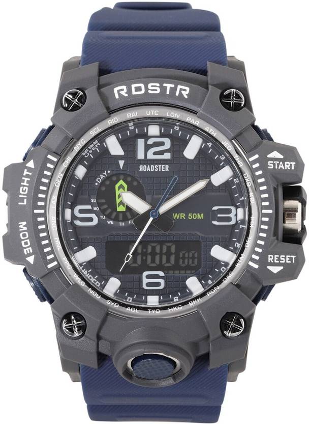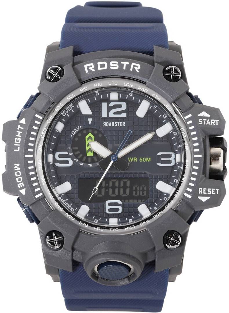 Pack Contains: single watch Display: analogue and digital Movement: quartz Power Source: battery Dial style: navy blue textured round stainless steel dial Features: multi function Strap Style: navy blue, regular, synthetic strap with a tang closure Water resistance: 50 m Comes in a signature Roadster case