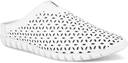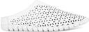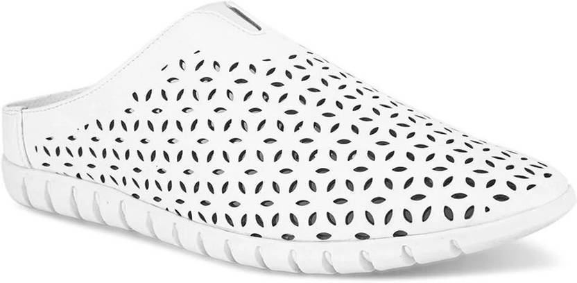 A pair of white laser cuts mules with regular styling has a slip-on closure
