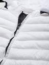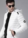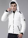 White solid padded jacket, has a hood, two pockets, a zip closure, long sleeves, straight hemline, and polyester lining. The model (height 6') is wearing a size M.