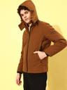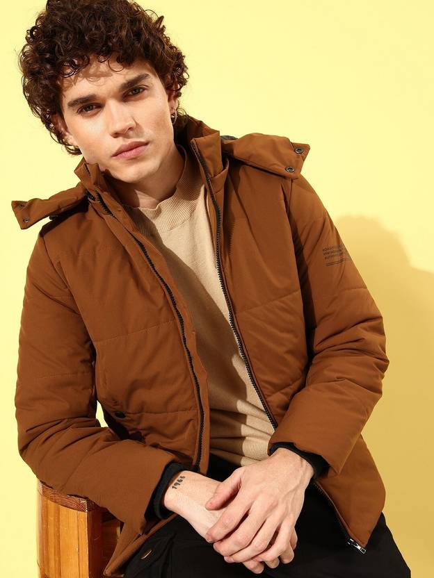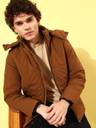 Rust brown solid padded jacket with zip detail Has a ditachable hood Has small typography print detailing at the back and sleeve 2 pockets Has a zip closure Long sleeves Straight hemline Polyester lining Shell: 100% Polyester Lining: 100% Polyester Machine Wash The model (height 6') is wearing a size M