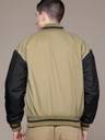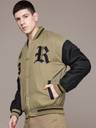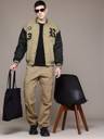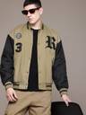 Step out in style with this Beige and Black padded Varsity Bomber jacket from Roadster. Crafted from durable polyester, this solid jacket features a stand collar, long sleeves, and a snap button closure for a snug fit. It comes equipped with three pockets for your essentials and is detailed with a typography print. The ribbed hemline adds a classic touch, making it a perfect choice for your casual winter outings.
