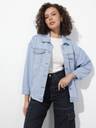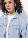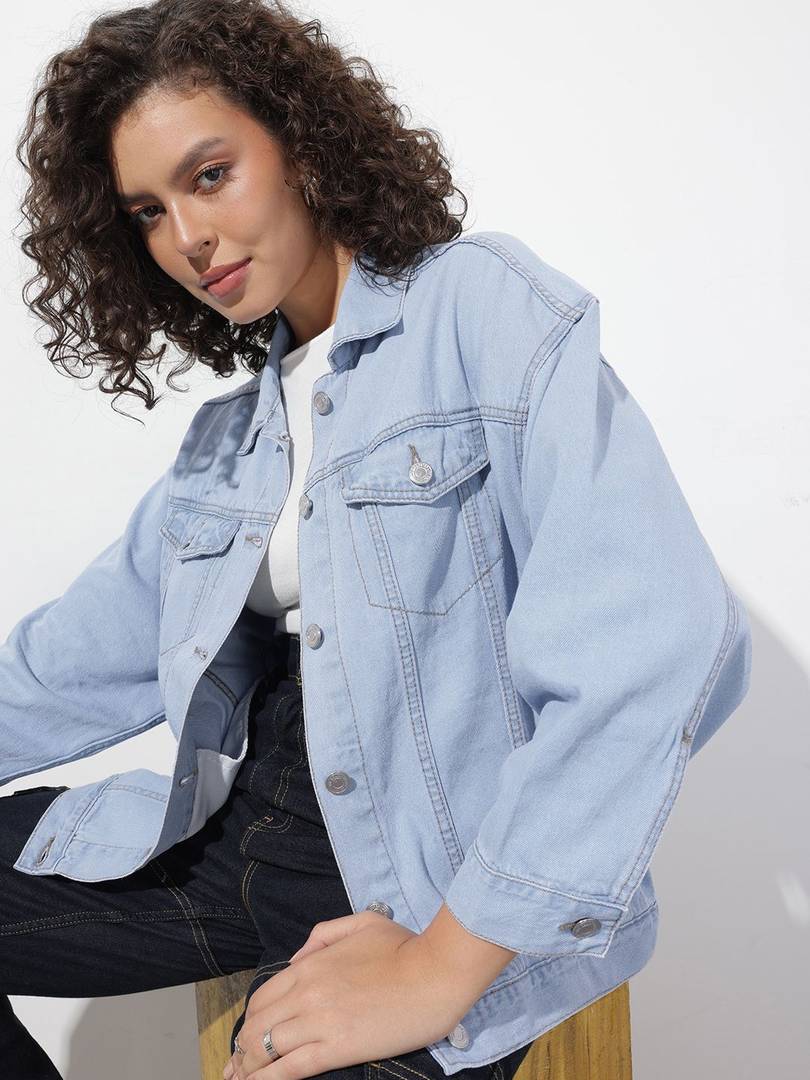 Blue solid denim jacket, has a spread collar, 4 pockets, has a button closure, long sleeves, straight hemline