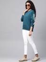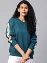 Teal green solid sweatshirt, has a round neck, drop shoulder long sleeves with side stripe detail and straight ribbed hem. Youre on your way to a warmer winter with this cuddly Roadster sweatshirt. Top off your favourite tank with this teal piece and pair it with trim denims when youre running errands.