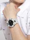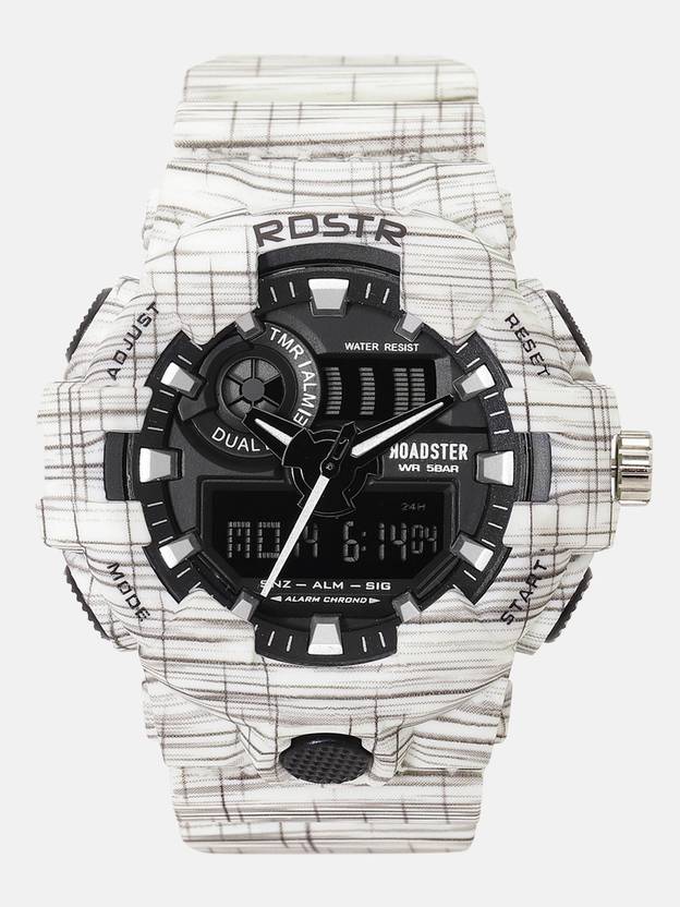 Display: Analogue and DigitalMovement: QuartzPower source: BatteryDial style: Solid round stainless steel dialFeatures: Multi Function, Alarm, LED BacklightStrap style: White printed regular, silicon strap with a tang closureWater resistance: 50 mComes in a signature Roadster case. This impressive, trendy watch from Roadster is sure to draw attention when you tell the time. Team this black watch with trim denims and a nice T-shirt when you're meeting your pals for dinner and drinks.