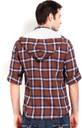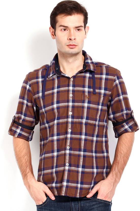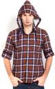 Brown and navy blue woven checked casual shirt, has a spread collar, a detachable hood with contrast lining and drawstring fastening, long sleeves with contrast-lined button cuffs and roll-up tab features, a full button placket on the front, a patch pocket with embroidered branding on the left side of the chest, yoke on the back, a curved hem with overlays on the sides