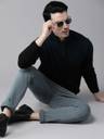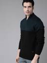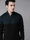 Black and teal Blue colourblocked pullover sweater, has a mock collar, long sleeves, half zipper closure, and ribbed hem. When the temperatures drop, opt for this in-season sweater by Roadster. This black piece can be matched with dark denims and canvas shoes for a must-have look for the weekend.