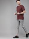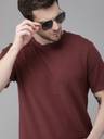 Burgundy solid T-shirt, has a round neck, and short sleeves. The feel of this Roadster tee is absolutely amazing thanks to the designers use of cotton. When youre grabbing a quick meal with your friends, this burgundy piece looks great with slimmer pants and chukka boot.