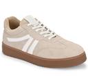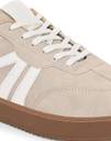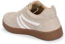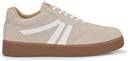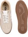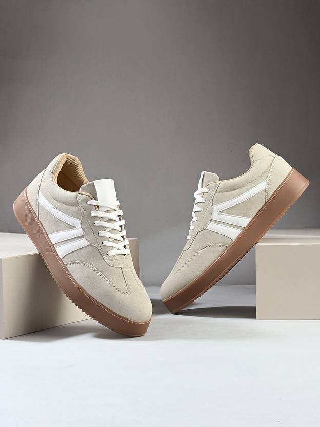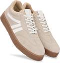 A pair of cream solid round toe casual sneakers with regular styling has a lace-up closure,Sueder upper,Cushioned footbed,Textured and patterned TPR outsole