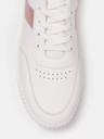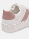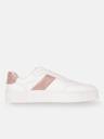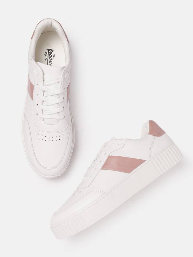 A pair of round toe white and dusty pink perforated sneakers with striped detail, has regular styling, Lace-up closure Synthetic upper Cushioned footbed Textured and patterned outsole Warranty: 1 month Warranty provided by the brand owner/ manufacturer