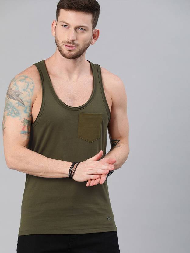 Olive green solid T-shirt, has a round neck, sleeveless, and 1 pockets. The feel of this Roadster tee is absolutely amazing thanks to the designers use of cotton. This olive piece can be styled with dark denims and canvas shoes when youre going out to eat with your friends.