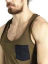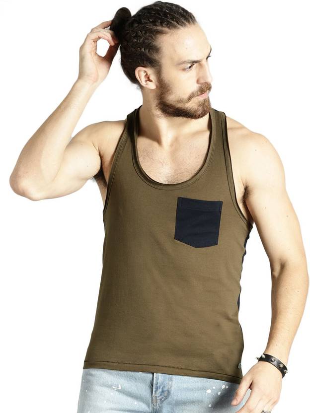 Olive Green and navy blue solid T-shirt, has a scoop neck, sleeveless, 1 pocketThis tee made by Roadster will definitely become a go-to item in your wardrobe. When you're grabbing a quick meal with your friends, this olive piece looks great with slimmer pants and chukka boot.