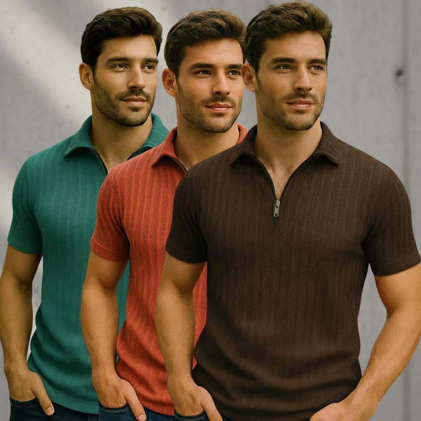 Roadster Pack of 3 Men Solid Zip Neck Polycotton Multicolor T-Shirt