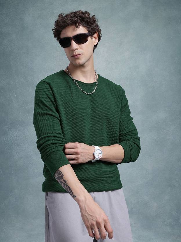 Roadster Solid Round Neck Casual Men Green Sweater