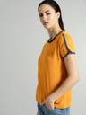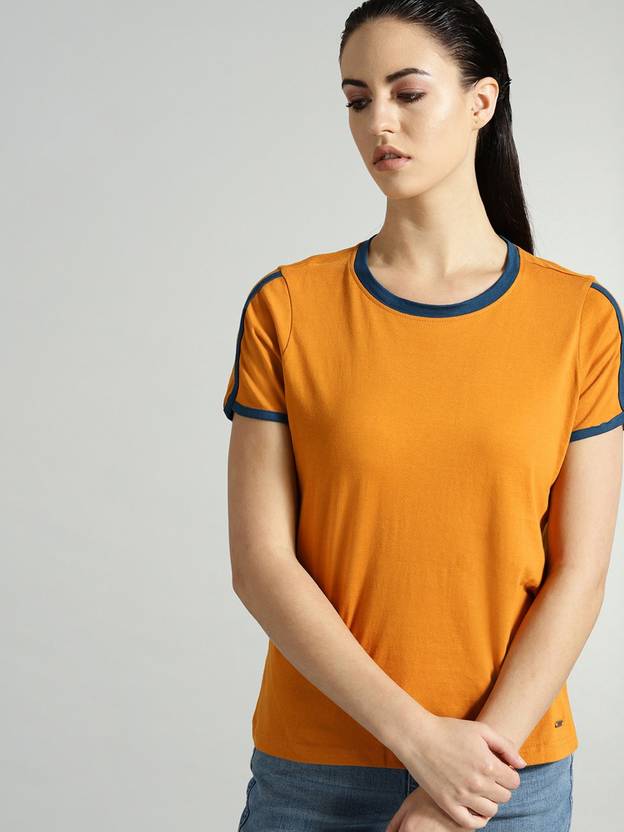 Mustard yellow solid T-shirt, has a round neck, and short sleeves. This Roadster mustard cotton tee will add versatility to your wardrobe. This mustard piece can be teamed with cutoff denim shorts for a lazy weekend look or layered under a fitted jacket for a night out with friends.