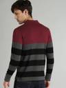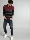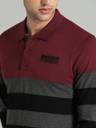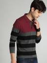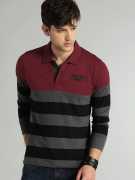 Charcoal grey, black and burgundy striped waist length T-shirt, has a polo collar, long sleeves, a short button placket, vented hem. Elevate the look of your wardrobe with a few more basic tees like this high-end cotton one from Roadster. This piece can be teamed with cuffed chinos and canvas shoes when you're meeting the guys for drinks.