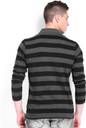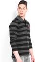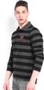 Black and charcoal grey melange knitted striped polo T-shirt, has a ribbed polo collar, a short button placket, long sleeves, embroidered brand applique on the left side of the chest, vented hem with back hem longer than the front. Refresh your off-duty fashion arsenal with this stylish polo T-shirt from Roadster. It is best styled with a pair of jeans or cargo shorts and canvas shoes for the perfect weekend look.