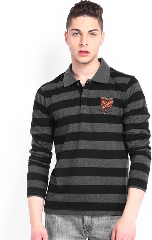 Roadster Super 123 Men Striped Polo Neck Cotton Blend Black T-Shirt