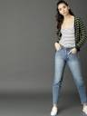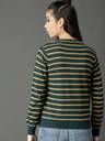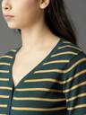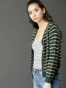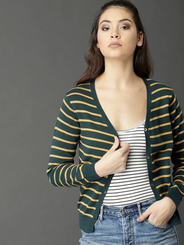 Green and yellow striped cardigan, has a V-neck, long sleeves, ribbed hem, button closure. This high-fashion sweater from Roadster will take your style to the next level. When youre meeting the girls for cocktails, style this piece with trim denims and caged heels.