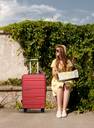 This stylish turquoise suitcase is a perfect blend of modern design and travel-ready functionality. Crafted with a durable hard shell and accented by horizontal ridges, it offers excellent protection for your belongings while maintaining a sleek, contemporary look. The suitcase features a telescopic silver handle for easy maneuvering and four smooth-rolling wheels that ensure effortless mobility across various surfaces. White corner protectors add a touch of contrast while enhancing durability, making it ideal for frequent travelers. With the "ROAMX" brand label displayed prominently on the front, this luggage piece combines elegance and practicality—ready to accompany you on every adventure.