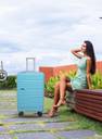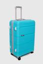This stylish turquoise suitcase is a perfect blend of modern design and travel-ready functionality. Crafted with a durable hard shell and accented by horizontal ridges, it offers excellent protection for your belongings while maintaining a sleek, contemporary look. The suitcase features a telescopic silver handle for easy maneuvering and four smooth-rolling wheels that ensure effortless mobility across various surfaces. White corner protectors add a touch of contrast while enhancing durability, making it ideal for frequent travelers. With the "ROAMX" brand label displayed prominently on the front, this luggage piece combines elegance and practicality—ready to accompany you on every adventure.