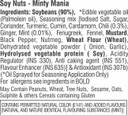 | Ingredient | - "Ingredients:- Soybeans (90%), *Edible vegetable oil (Palmolein oil), Seasoning mix [Iodised Salt, Sugar, Coriander, Turmeric, Cumin, Cardamom, Chili (0.3%), Ginger, Mint (0.01%), Fenugreek, Fennel, Mustard, Black Pepper, Nutmeg, Wheat Flour (Wheat), Dehydrated vegetable powder ( Onion, Garlic), Hydrolysed vegetable protein ( Soy), Acidity Regulator (INS 330), Anti caking agent (INS 551), Flavour Enhancer (INS 635)] & Antioxidant (INS 307b) (*Oil Sprayed for Seasoning Application Only) May Contain Peanuts, Wheat, Tree Nuts, Sesame, Oats & Sulphite CONTAINS PERMITTED NATURAL COLOR (E141) AND ADDED FLAVOURS - [NATURAL AND NATURE IDENTICAL FLAVOURING SUBSTANCES (MINT)]"