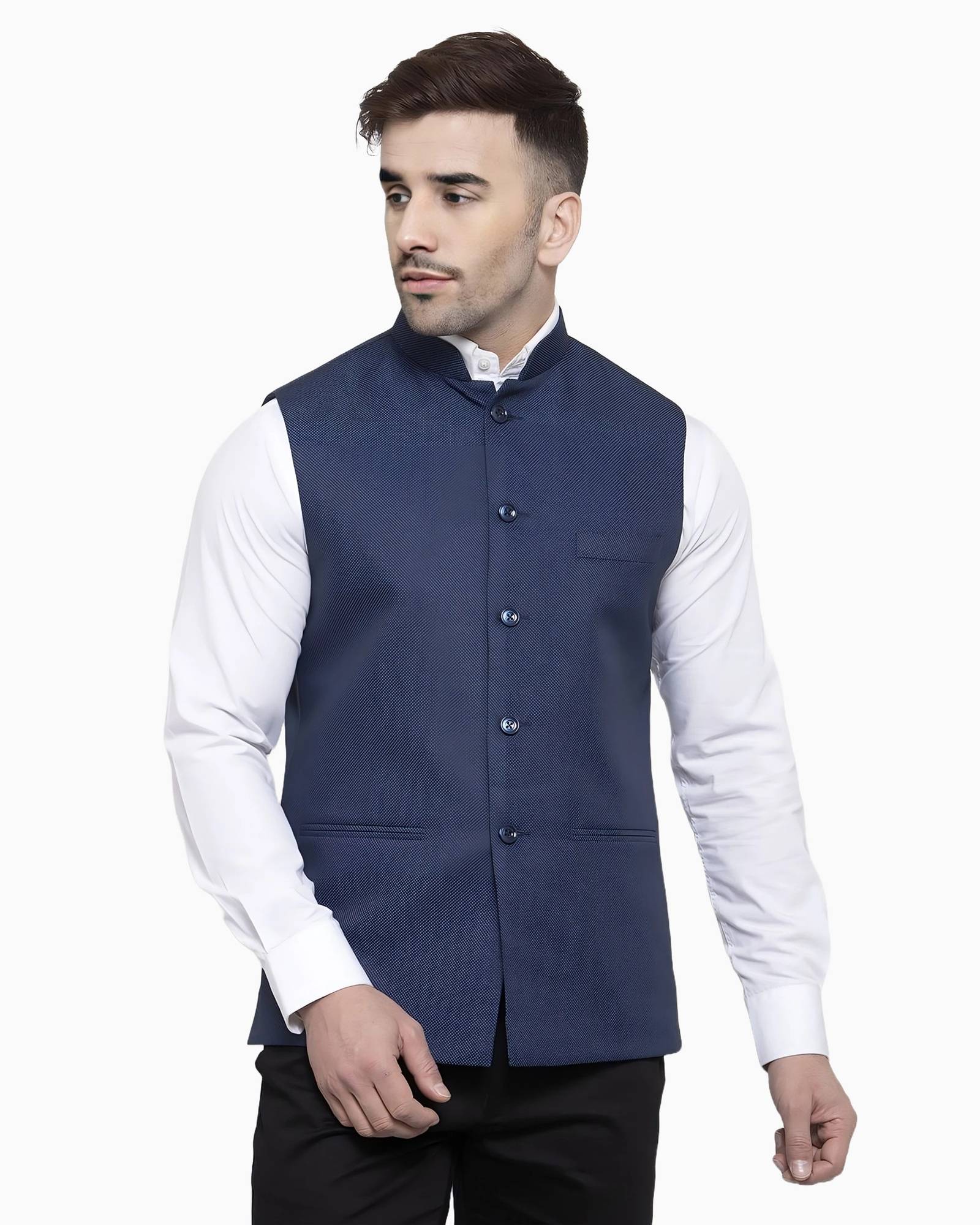 Men's cotton regular fit sleeveless solid Nehru Jacket is truly a versatile garment. Initially reserved for festive occasions in India, the garment is slowly making its way in casual and office wear. Layering this garment over a formal shirt makes for a chic office wear, Wearing the jacket over kurta shirt or kurta pajama is a perfect outfit for Indian events. Nehru Jacket comes with one chest pocket & two other front pockets.