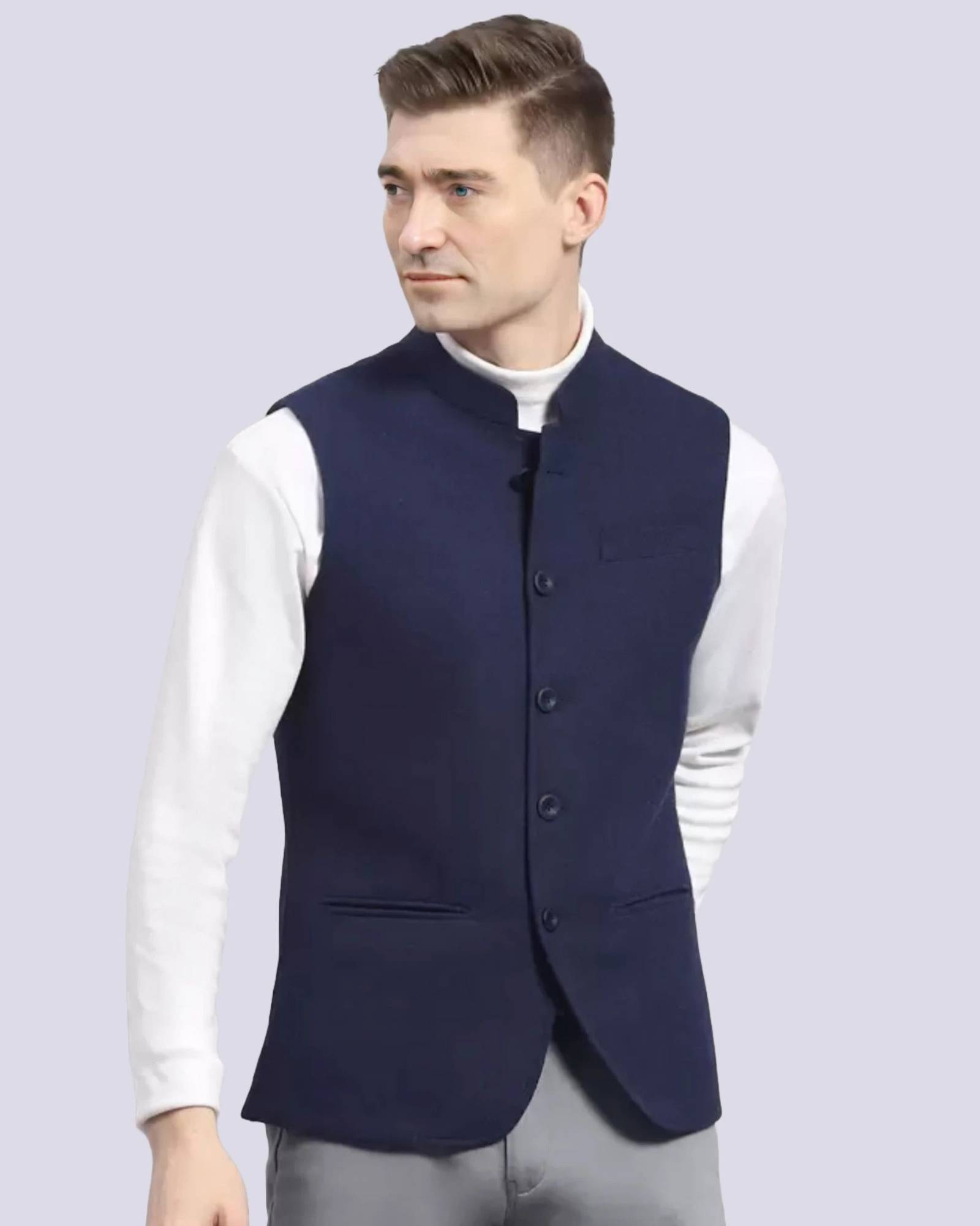 Men's cotton regular fit sleeveless solid Nehru Jacket is truly a versatile garment. Initially reserved for festive occasions in India, the garment is slowly making its way in casual and office wear. Layering this garment over a formal shirt makes for a chic office wear, Wearing the jacket over kurta shirt or kurta pajama is a perfect outfit for Indian events. Nehru Jacket comes with one chest pocket & two other front pockets.