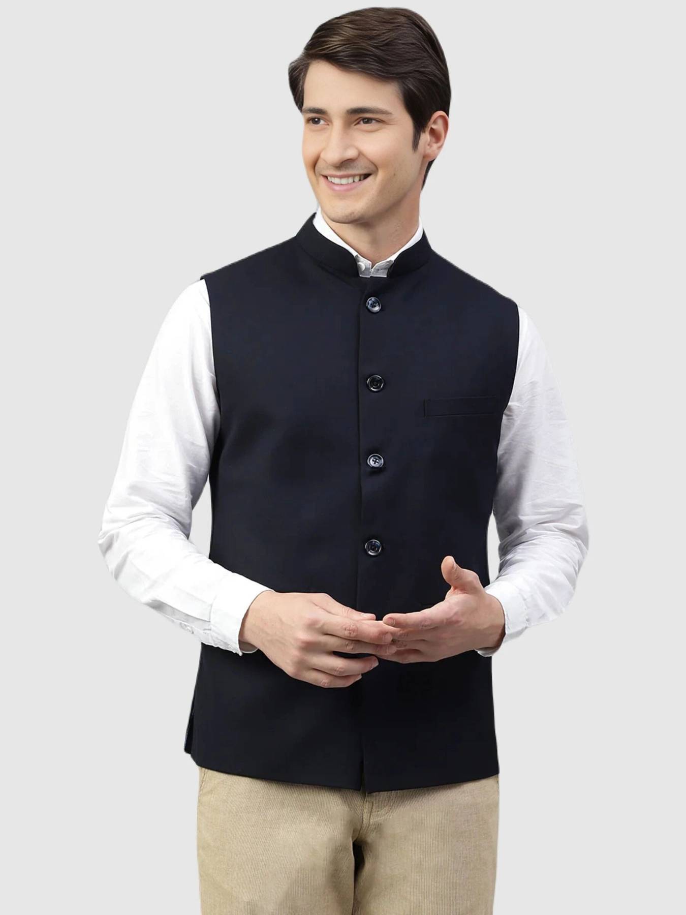 Men's cotton regular fit sleeveless solid Nehru Jacket is truly a versatile garment. Initially reserved for festive occasions in India, the garment is slowly making its way in casual and office wear. Layering this garment over a formal shirt makes for a chic office wear, Wearing the jacket over kurta shirt or kurta pajama is a perfect outfit for Indian events. Nehru Jacket comes with one chest pocket & two other front pockets.