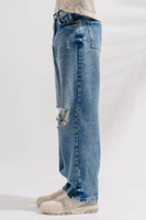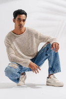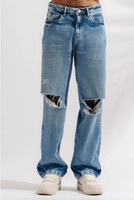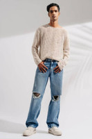 Featuring a solid construction with a subtle light fade, these men's jeans present a clean, modern look. The knee cut adds a hint of ruggedness, which enhances the overall style while maintaining a sharp, contemporary appearance. Mild distressing along the edges gives the jeans a slightly worn feel, offering a relaxed yet sophisticated vibe. This mix of details makes them a great choice for a variety of occasions, from casual weekends to evening outings.