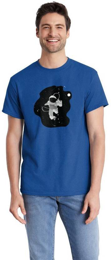 Men Lost in Space Graphic Print Round Neck Pure Cotton Blue T-Shirt
