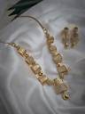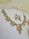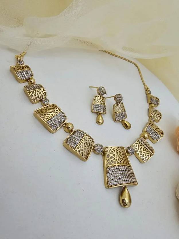 "Elevate your style with this contemporary and chic necklace set, meticulously crafted in Surat, Gujarat. This set features a striking geometric design, blending modern aesthetics with traditional craftsmanship. The necklace showcases square and circular elements adorned with sparkling CZ (Cubic Zirconia) stones, creating a dazzling effect. The unique cut-out patterns add an intricate touch, making it a standout piece. The matching drop earrings echo this design, each featuring a lustrous gold-plated drop, adding a touch of elegance and movement. Perfect for parties, festive occasions, or as a statement piece for special events, this necklace set is designed to enhance your modern ethnic look. Crafted with high-quality materials, this set promises durability and a luxurious finish. Experience the exceptional craftsmanship of Surat's artisans with this stunning necklace set."