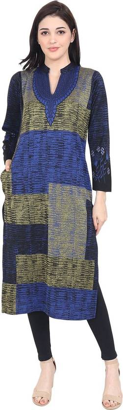 Features: Straight Kurti, Full Sleeves, Mandarin Collar V Neck, Calf Length, 2 Side Pockets, Jacquard Knitting, Length is 45-46 Inches