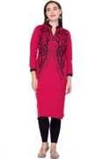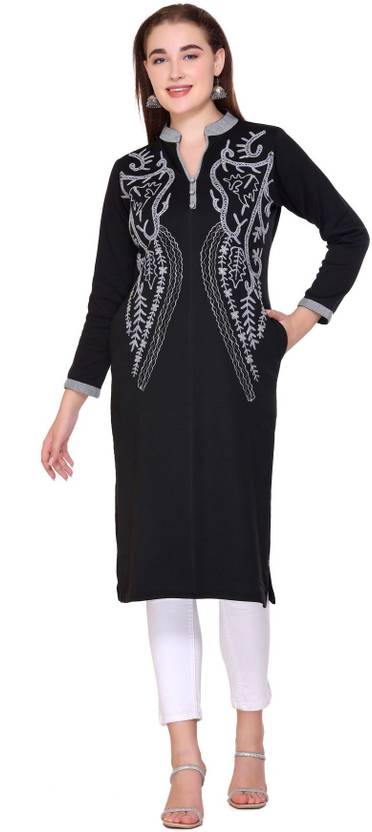Features: Straight Kurti, Full Sleeves, Mandarin Collar V Neck, Calf Length, 2 Side Pockets, Jacquard Knitting, Length is 45-46 Inches