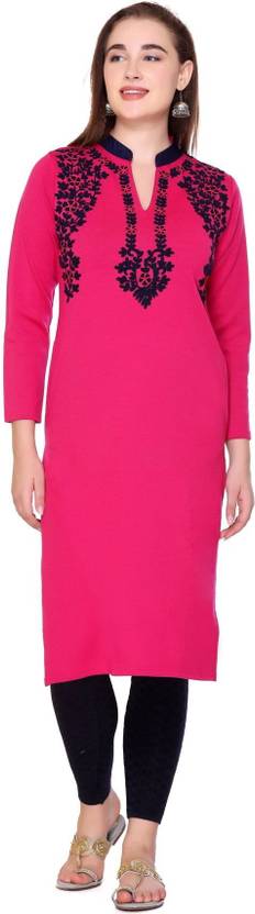 Features: Straight Kurti, Full Sleeves, Mandarin Collar V Neck, Calf Length, 2 Side Pockets, Jacquard Knitting, Length is 45-46 Inches