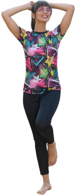This two piece t-shirt with legging set offers full body coverage and complete sun protection, the leggings paired with the stylish digital printed flared top provide both a perfect balance of modesty and style, ideal for visits to the pool or holidays, the contrasting colours are elegantly matched to create a simple yet stylish combination.